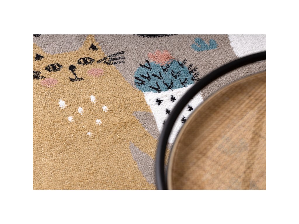 Dětský kusový koberec Fun Kittens Cats beige je barevný a velmi příjemný koberec. Zobrazují se na něm veselé i spící kočičky. Má velmi jemný střižený vlas ze 100% polypropylenu, ten koberci dává měkkost a jemnost. Tento typ materiálu též má výbornou teplotní izolaci, nemusíte se už bát chladu z podlahy. Na výrobu nebyla použitá žádná toxická látka a tím výrobek je velmi vhodný i pro alergické děti.