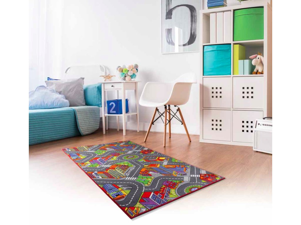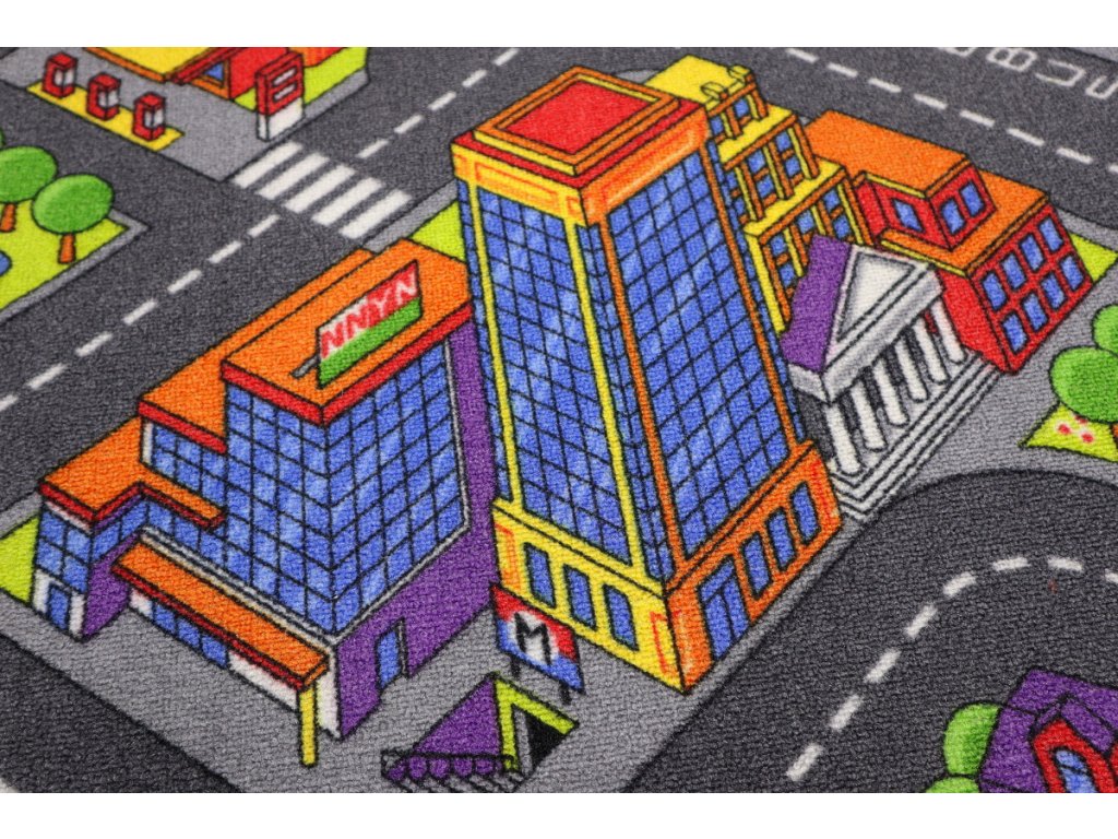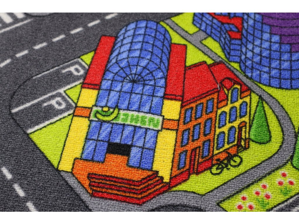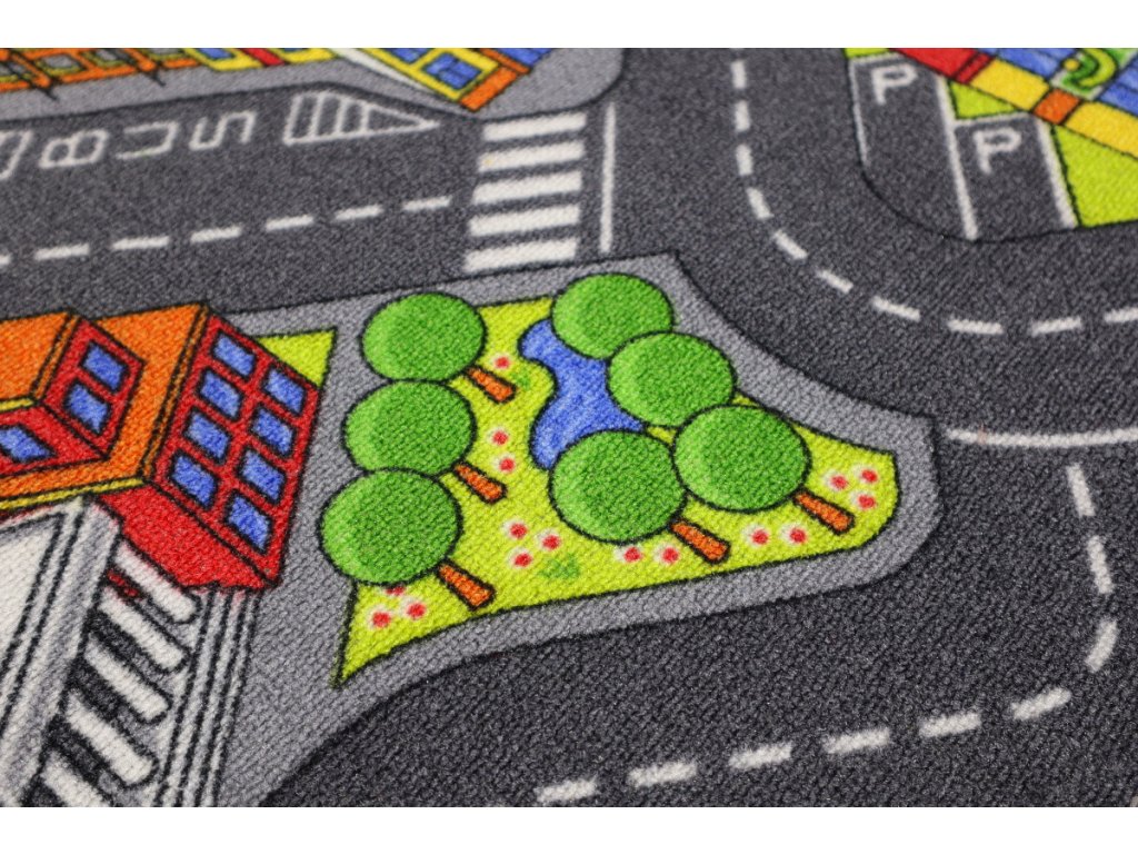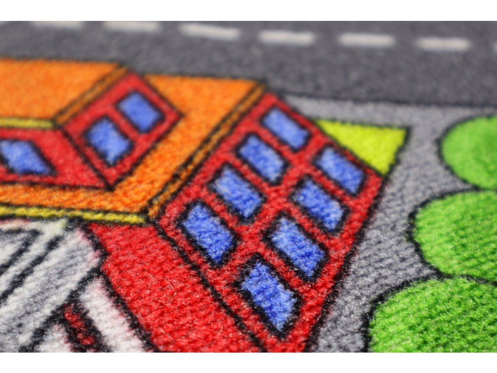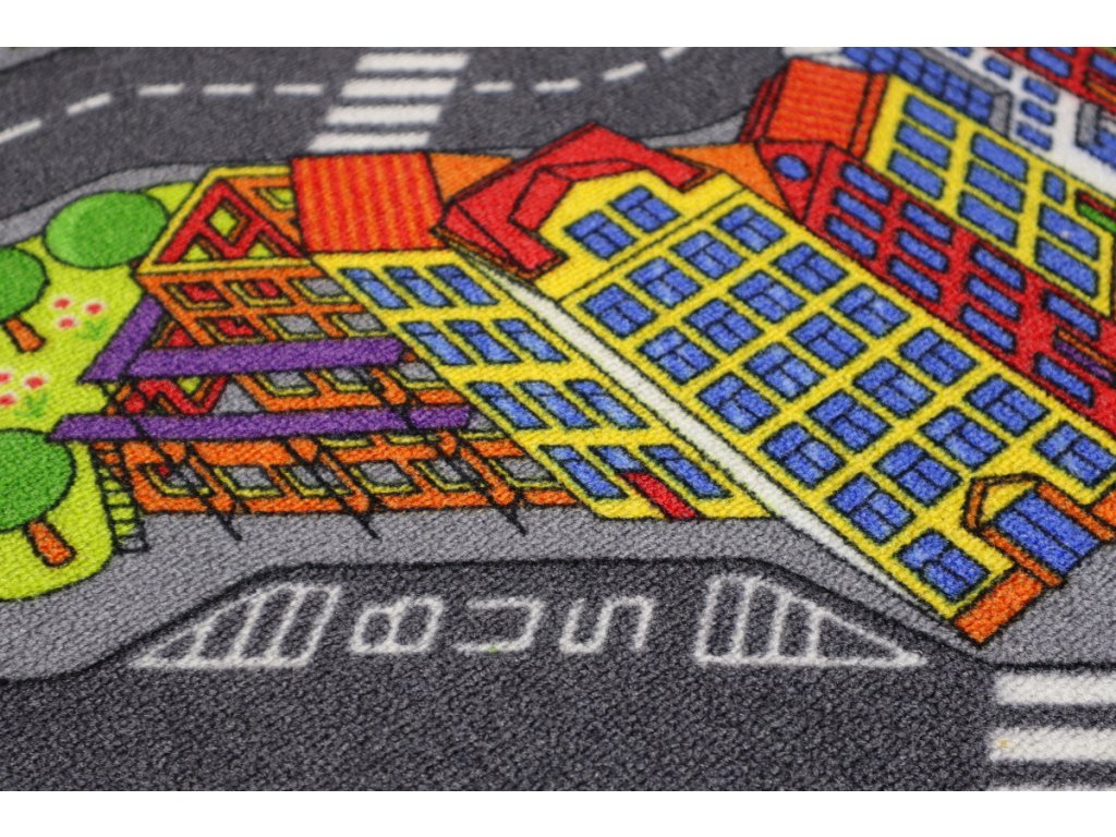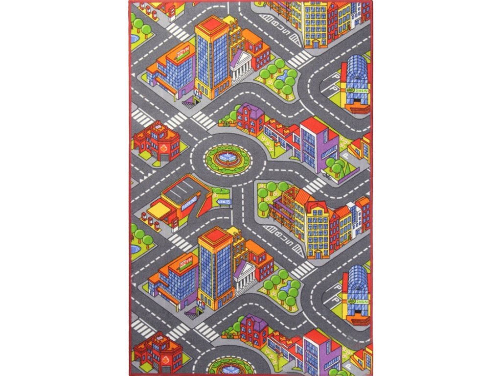 Dětský koberec Big City je hravý a barevný koberec plný malých dobrodružství, který promění každý dětský pokoj v živé město. Je na něm vykreslená síť šedých silnic s bílým dopravním značením, kruhovými objezdy, přechody, parkovišti a odbočkami, takže je ideální pro hraní s autíčky. Město doplňuje pestrá architektura, vysoké mrakodrapy, obytné domy, obchody, hasičárna, parkoviště i malá fontána uprostřed kruháče. Díky výrazným barvám je koberec vizuálně atraktivní a podporuje dětskou představivost. Má pevné červené obšití, které brání třepení. Smyčkový vlas je odolný, nenáročný na údržbu a jako stvořený pro každodenní hraní. Koberec Big City je skvělou volbou pro děti, které milují autíčka, stavění měst nebo příběhové hry, a hodí se do pokojíčků, heren i školek jako praktická, zábavná a pohodlná podložka.