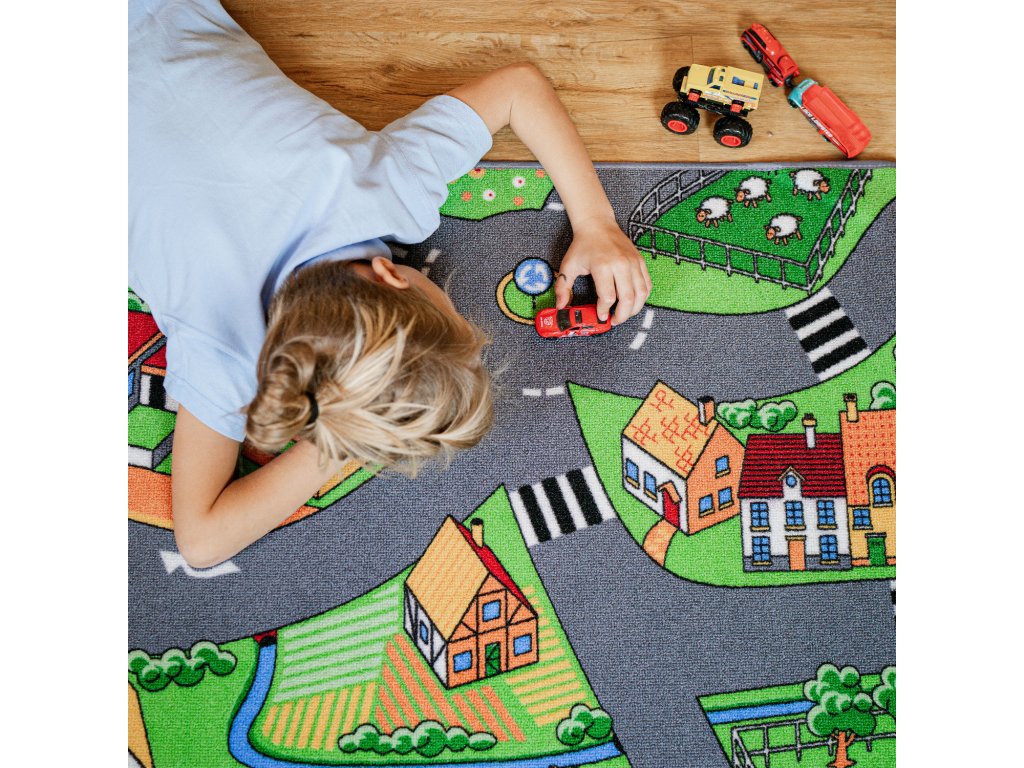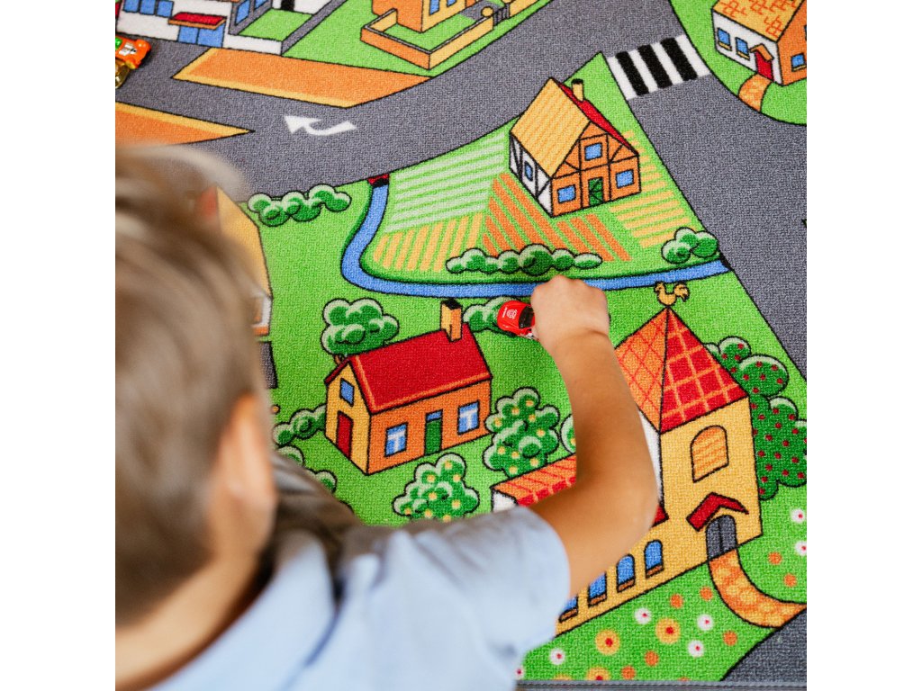 Kde zažít nejkrásnější jízdu v autě? No jasně, na venkově! Koberec Little Village s motivem máleho městečka nebo vesnice. Vaše děti si na něm hodně vyhrají a koberec to všechno vydrží. Kvalitní materiál s vysokou odolností je totiž samozřejmostí.