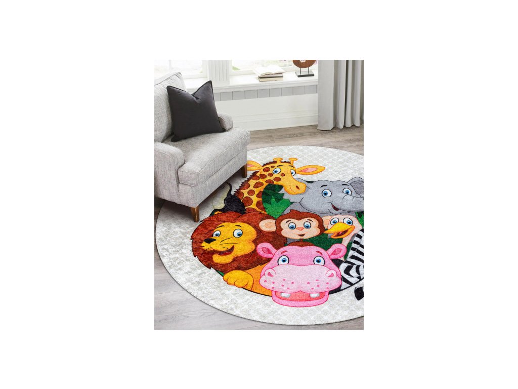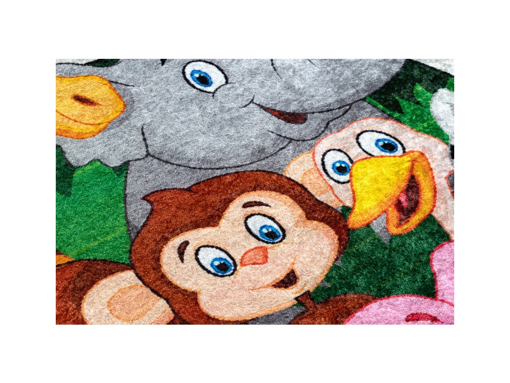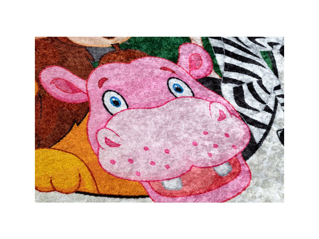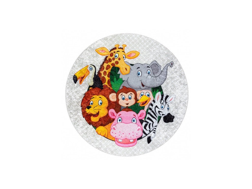 Krásný veselý dětský koberec s africkými zvířátky. Pestré barvy zpestří dětský pokojíček a vytvoří krásné a příjemné místo na hraní. Velkou výhodou toho koberce je absence vlasu, to pomůže k jednodušší údržbě a čistění, lze též prát v pračce do 30°C. Koberec je vyrobený ze 100% polyesteru. Bezpečnost proti smýkání koberce po podlaze zajišťuje pogumovaná spodní část, která ustojí i prudkým hrám.