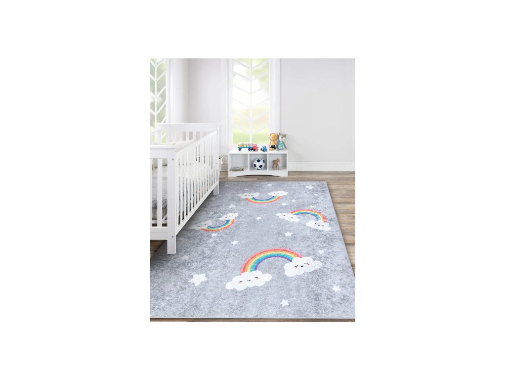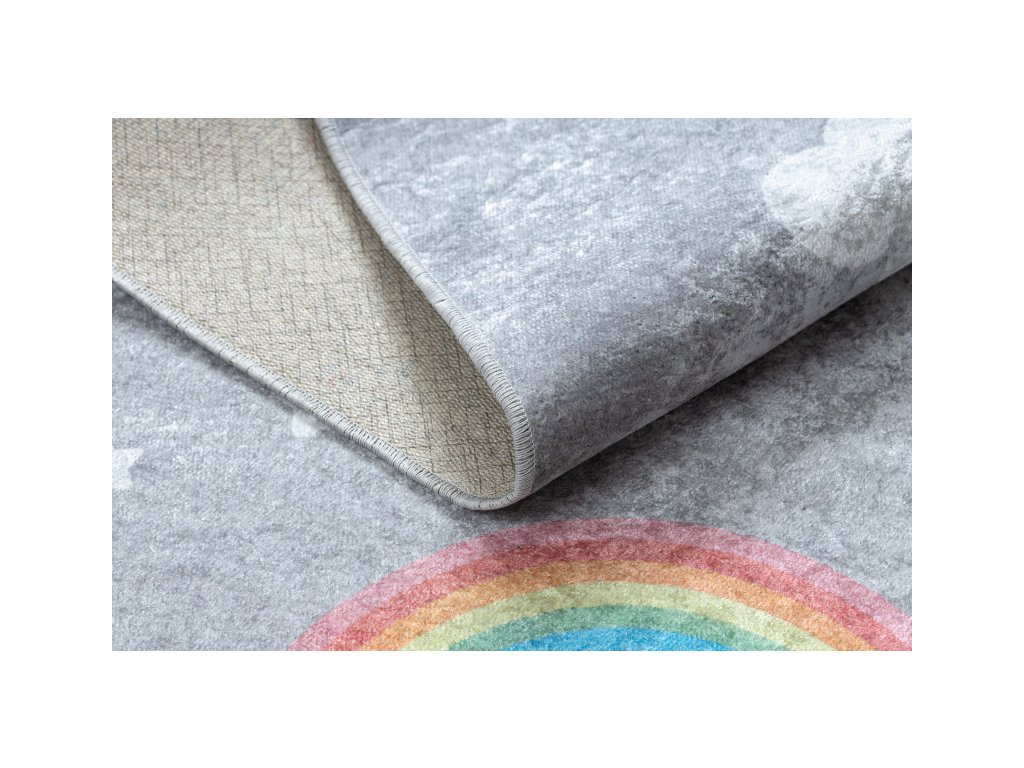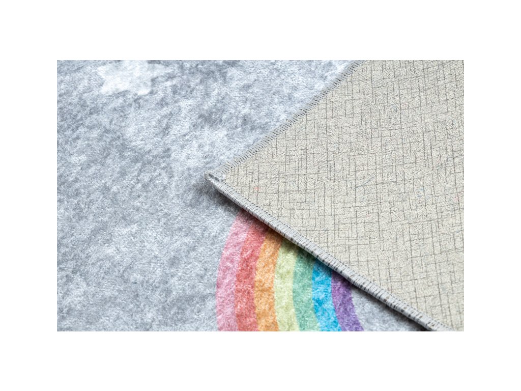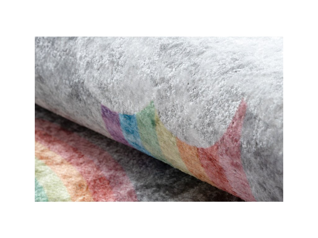 Dětský koberec z řady Junior v příjemné šedé barvě s duhami, udělá parádu v každém holčičím pokojíku. koberec má krásný vzhledem a vysokou praktičností i pro ty nejmenší. Velkou výhodou je možnost prát v pračce při teplotě do 30°C. Bezpečnost proti smýkání koberce po podlaze zajišťuje pogumovaná spodní část, která ustojí i prudkým hrám. Koberec je vyrobený ze 100% polyesteru. Tento materiál a možnost praní v pračce zajišťuje nehromadění různých typů alergenů. Koberec má certifikát OEKO-TEX.