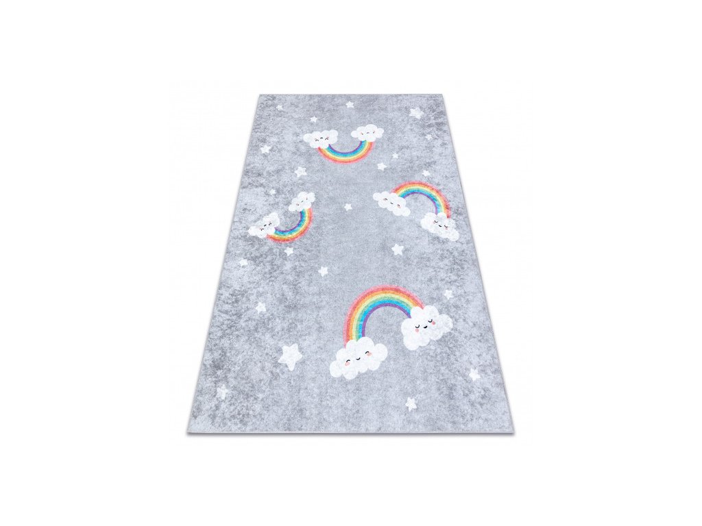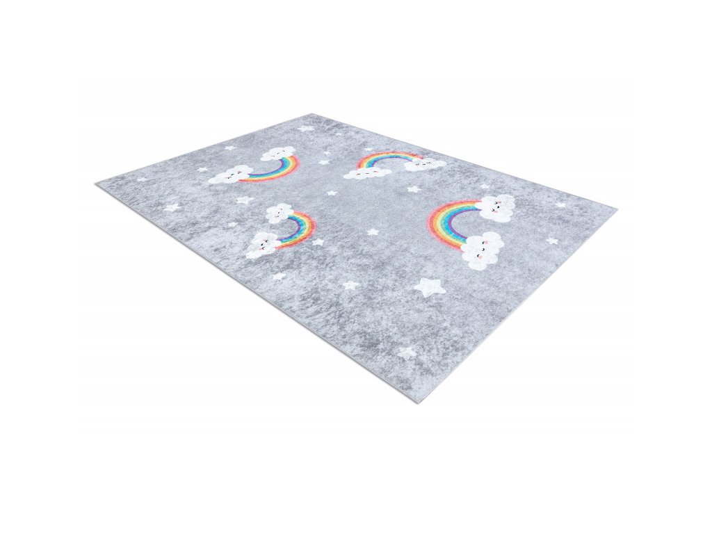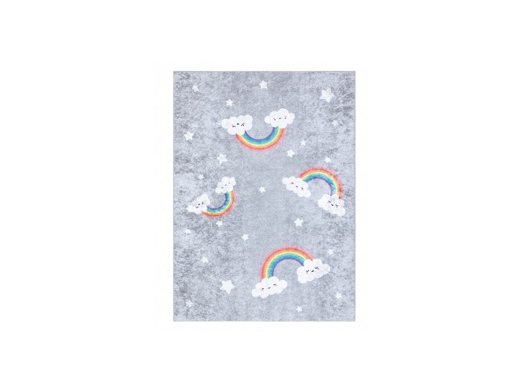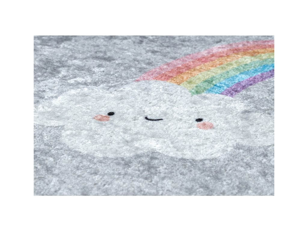 Dětský koberec z řady Junior v příjemné šedé barvě s duhami, udělá parádu v každém holčičím pokojíku. koberec má krásný vzhledem a vysokou praktičností i pro ty nejmenší. Velkou výhodou je možnost prát v pračce při teplotě do 30°C. Bezpečnost proti smýkání koberce po podlaze zajišťuje pogumovaná spodní část, která ustojí i prudkým hrám. Koberec je vyrobený ze 100% polyesteru. Tento materiál a možnost praní v pračce zajišťuje nehromadění různých typů alergenů. Koberec má certifikát OEKO-TEX.