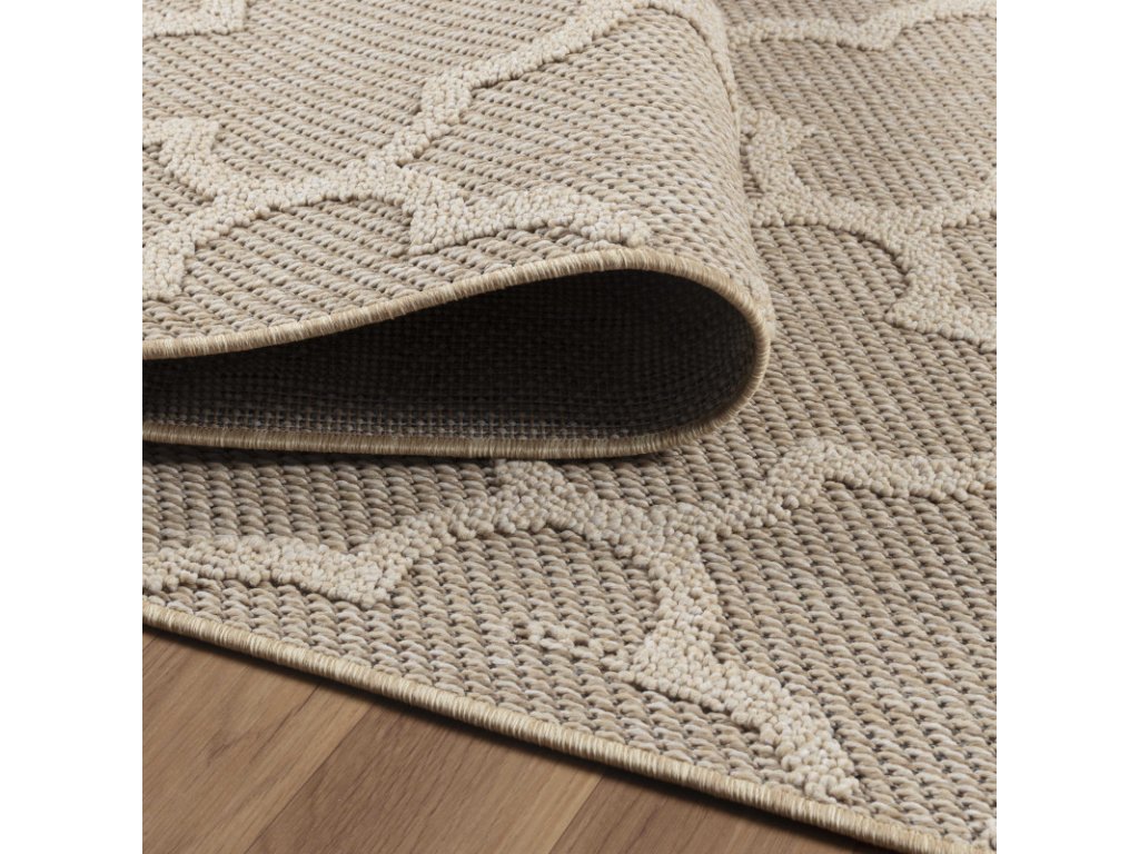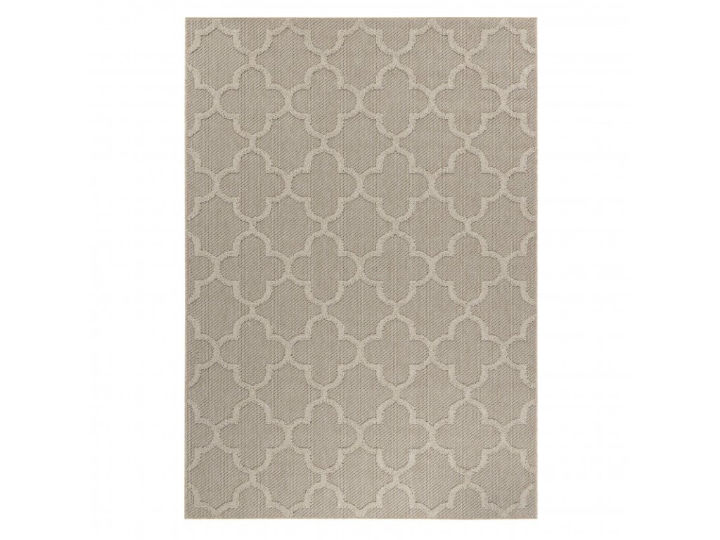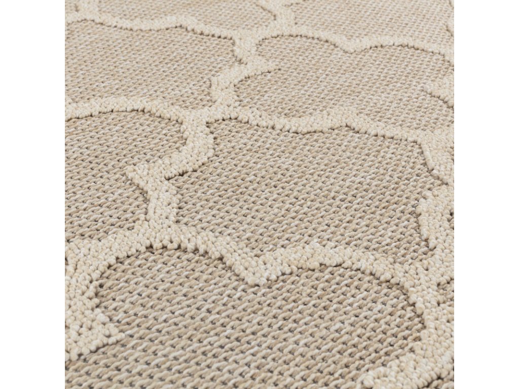 Béžový koberec s vystupujícími ornamenty, které vytvářejí poutavý 3D efekt. Smyčkový vlas z polypropylenového vlákna je velmi odolný a snadno udržitelný. Proto můžete koberec bez obav položit nejen v obývacím pokoji či chodbě, ale také na terase.