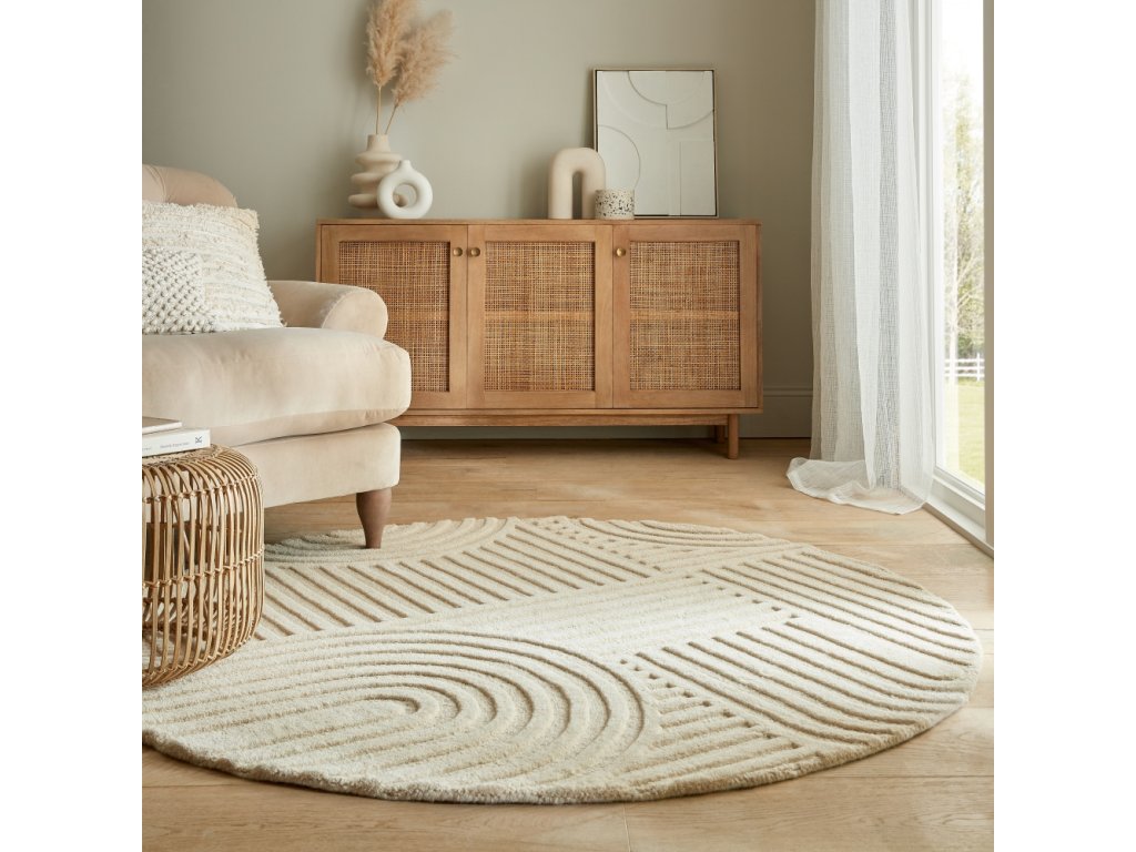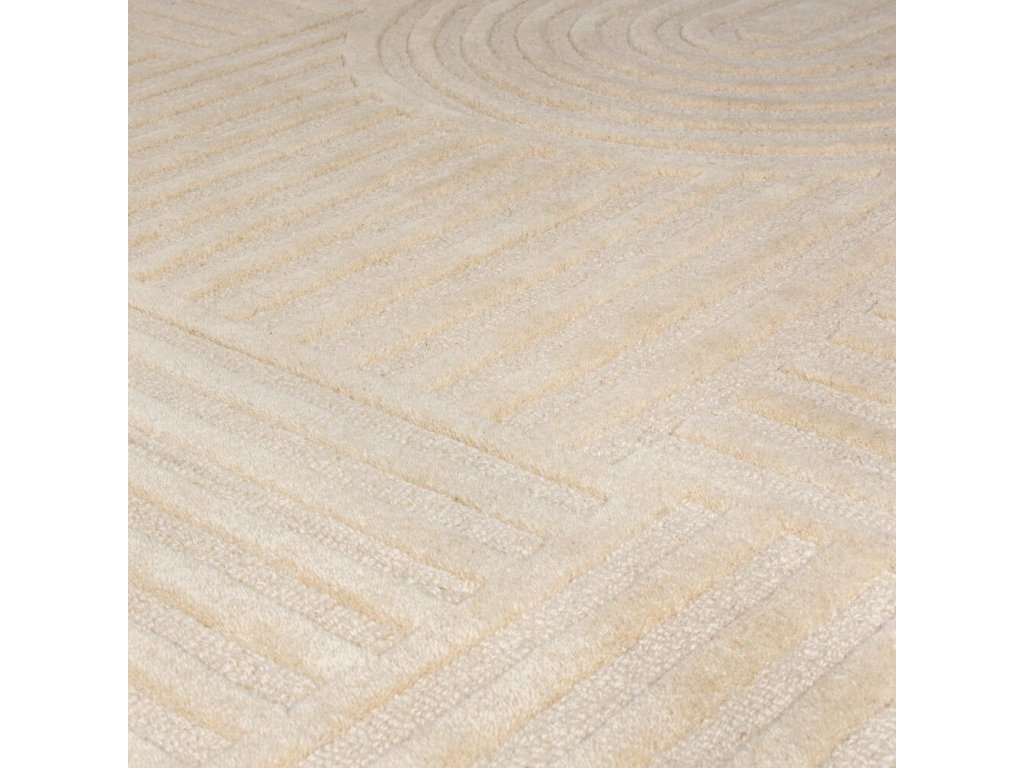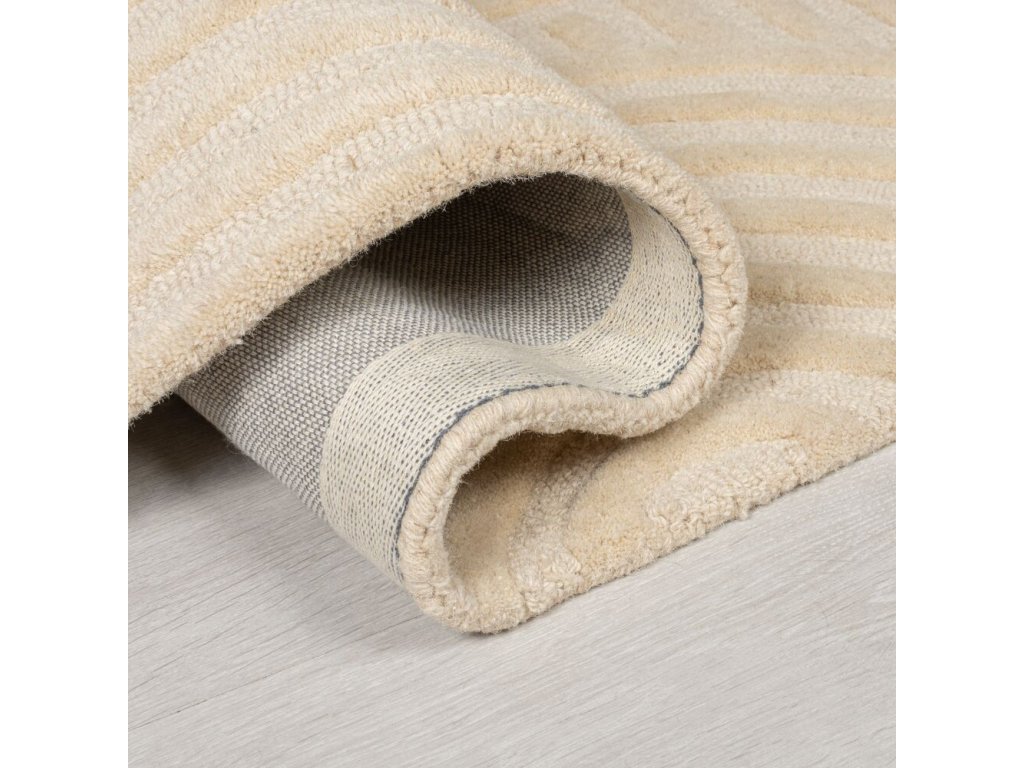 Béžový koberec s poutavým 3D vzorem díky své neutrální barvě skvěle doplní každý interiér. Nejlépe se hodí do obývacího pokoje k pohovce nebo do ložnice k posteli, protože je příjemný na došlap, izoluje chlad a tlumí hluk. To zajišťuje středně vysoký hustý vlas z přírodní vlny.