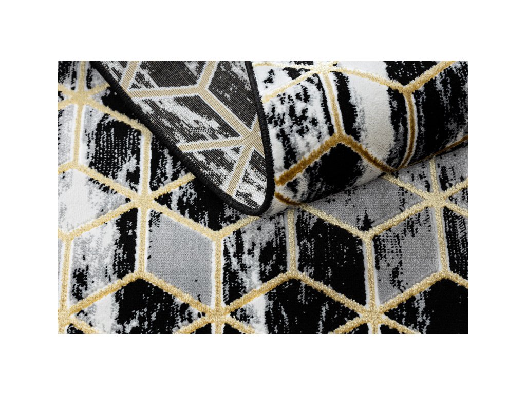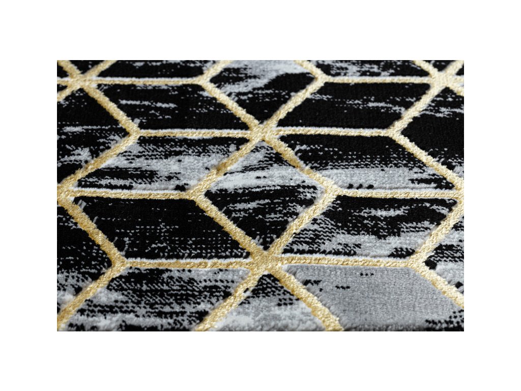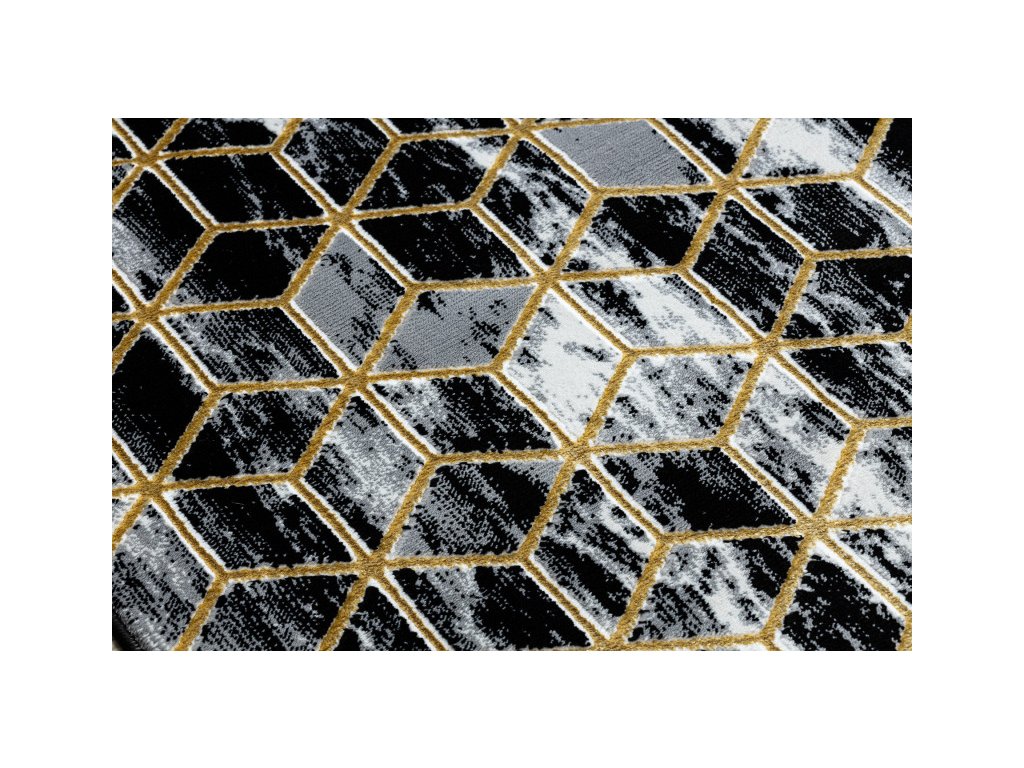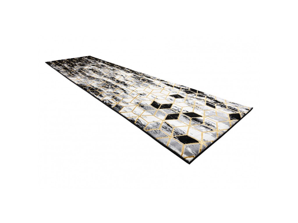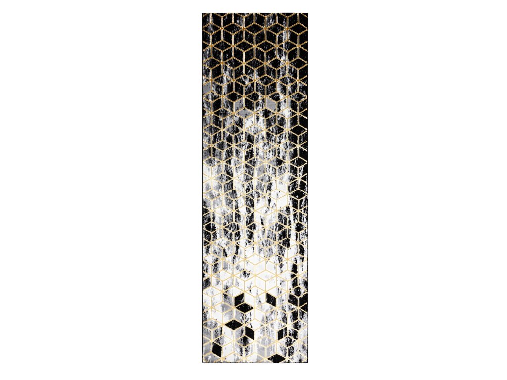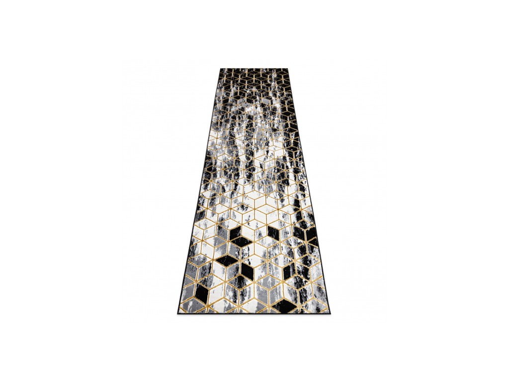 Běhoun Gloss cubes je velmi zajímavý s geometrickým vzorem. Vyobrazuje 3D strukturu kostek, které jsou propojeny s černošedou barvou se zlatým ohraničením. Tento běhoun si zamilují příznivci stylu glamour, art deco a oblíbenci geometrických vzorů. Jeho kombinace výrazných barev se zlatým vzorem vytvoří estetický středobod místnosti. Díky použitému materiálu je běhoun stálý a odolný. Vlákna vlasů jsou tvořeny do 3D efektu, který umocňuje moderní vzhled.