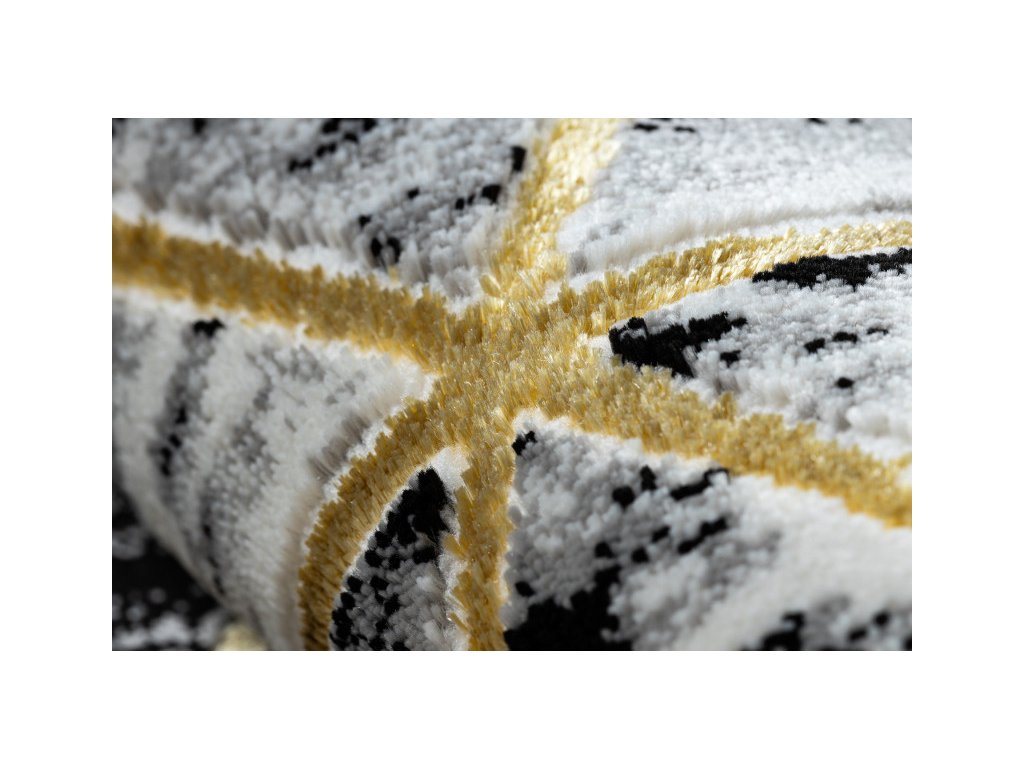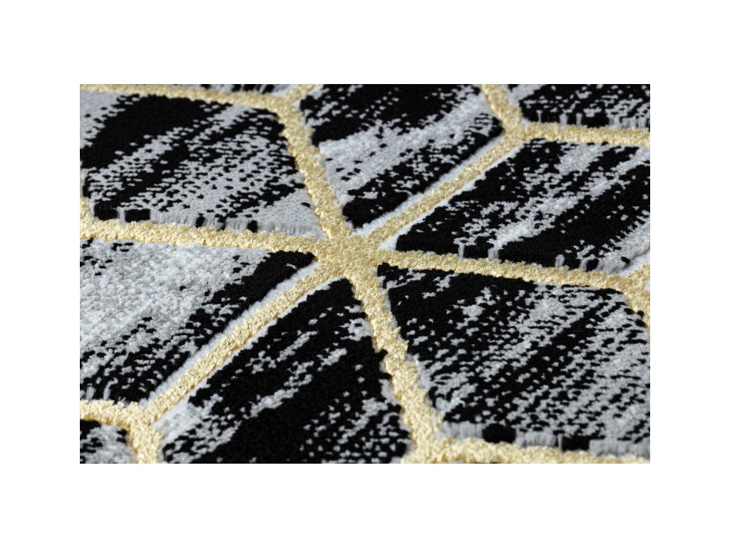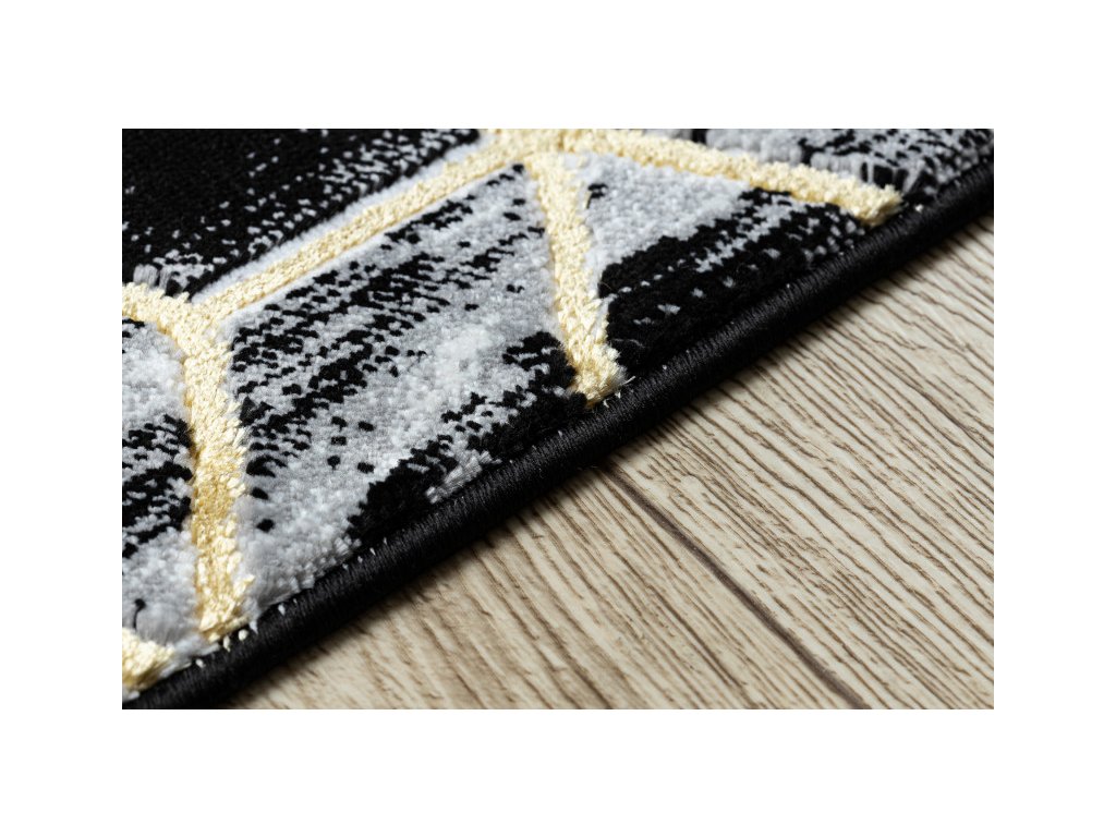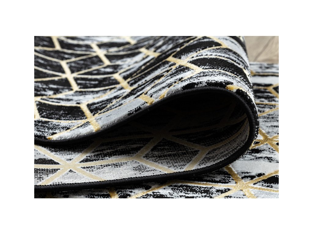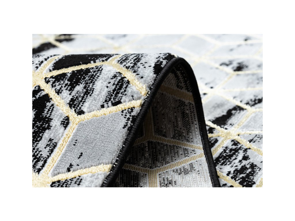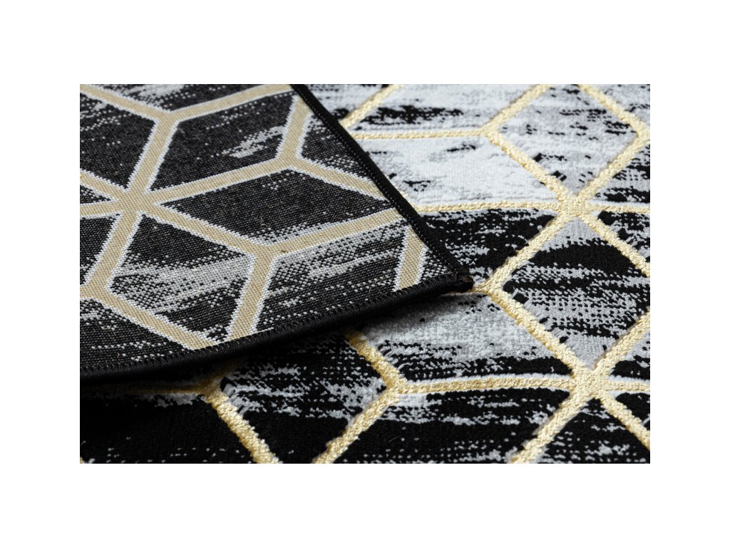 Běhoun Gloss cubes je velmi zajímavý s geometrickým vzorem. Vyobrazuje 3D strukturu kostek, které jsou propojeny s černošedou barvou se zlatým ohraničením. Tento běhoun si zamilují příznivci stylu glamour, art deco a oblíbenci geometrických vzorů. Jeho kombinace výrazných barev se zlatým vzorem vytvoří estetický středobod místnosti. Díky použitému materiálu je běhoun stálý a odolný. Vlákna vlasů jsou tvořeny do 3D efektu, který umocňuje moderní vzhled.