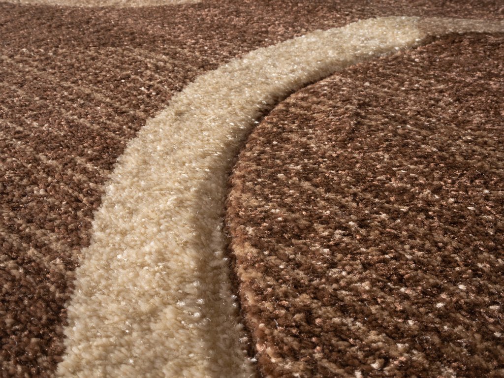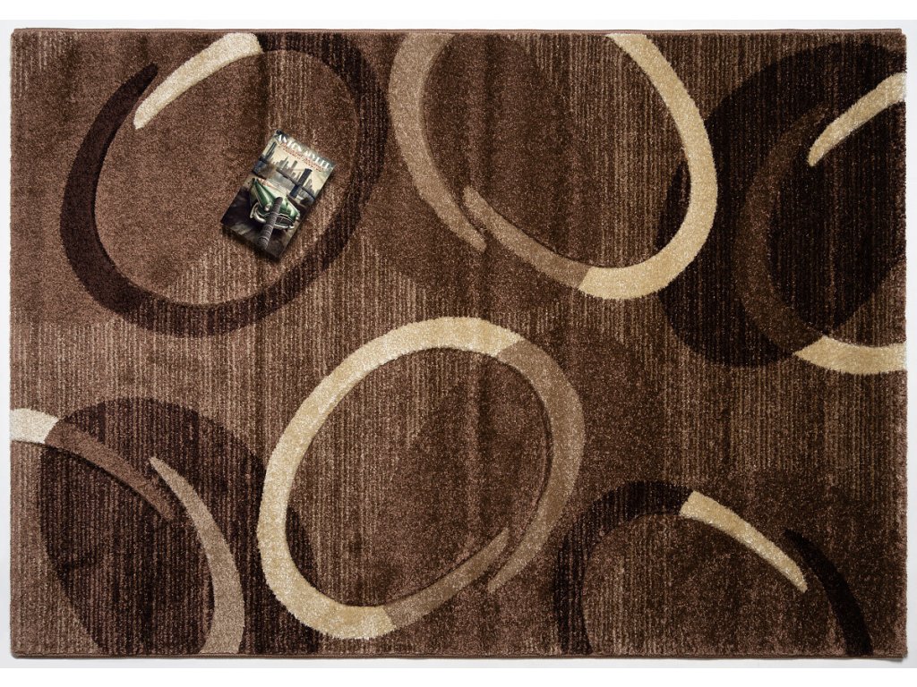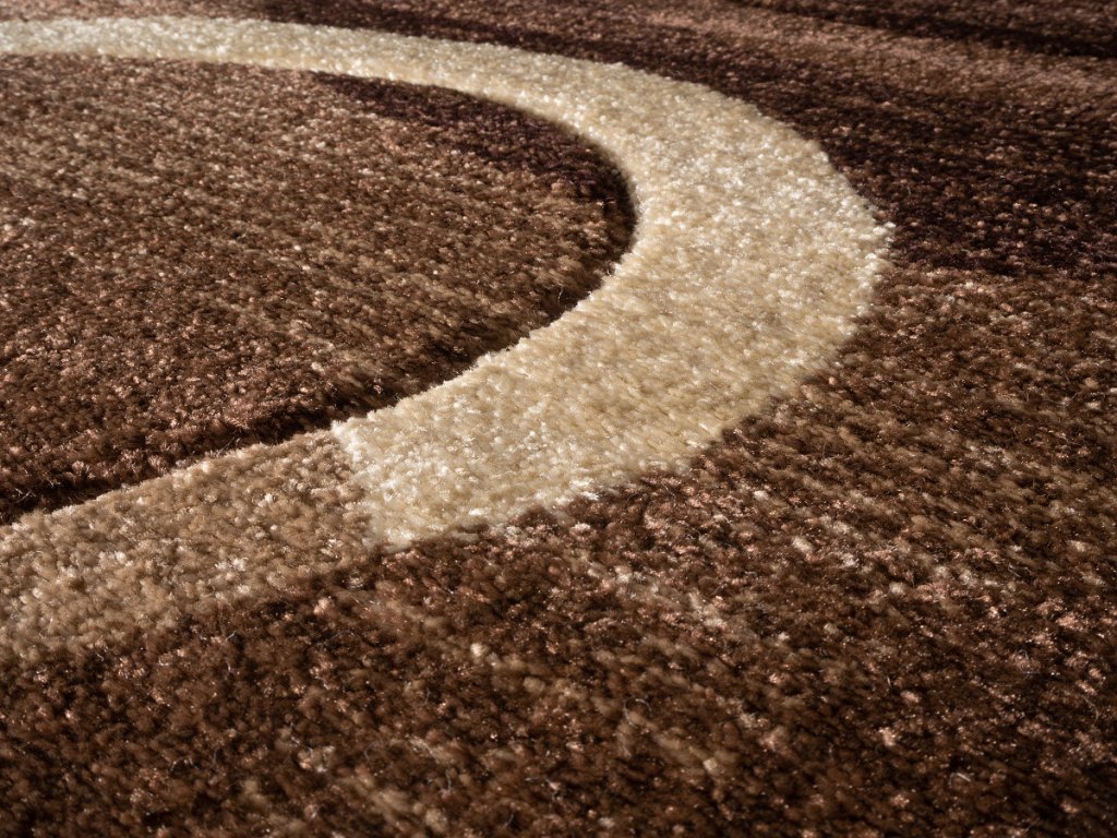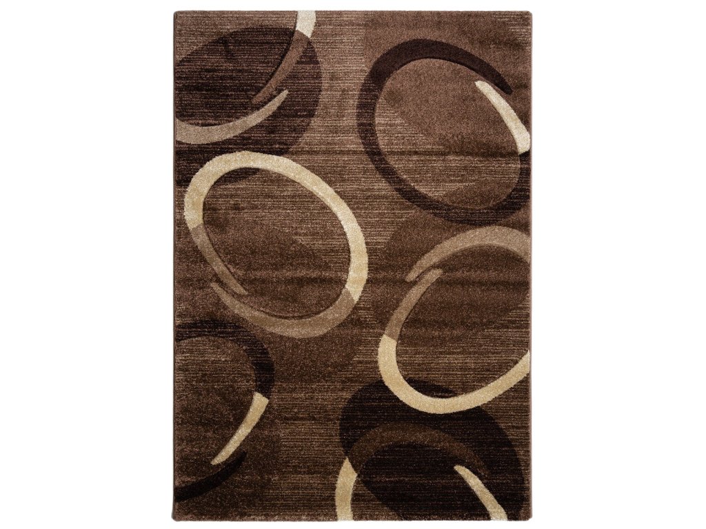 Kusový koberec Florida brown z velmi odolného polypropylenu heatset frizé se vzory koleček a proužků v hnědých a béžových odstínech, skvěle hodící se do obývacích pokojů, ložnic ale i do předsíní a hal.