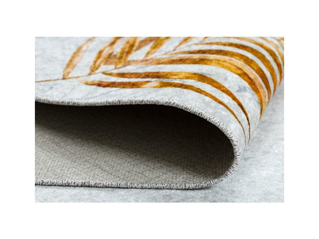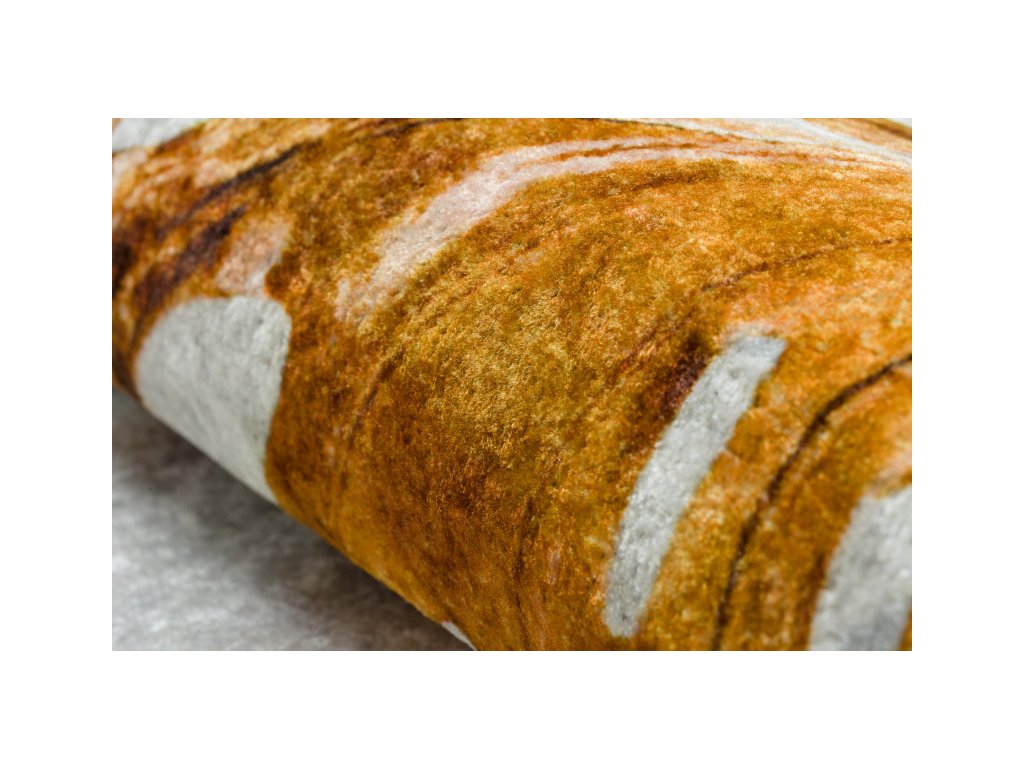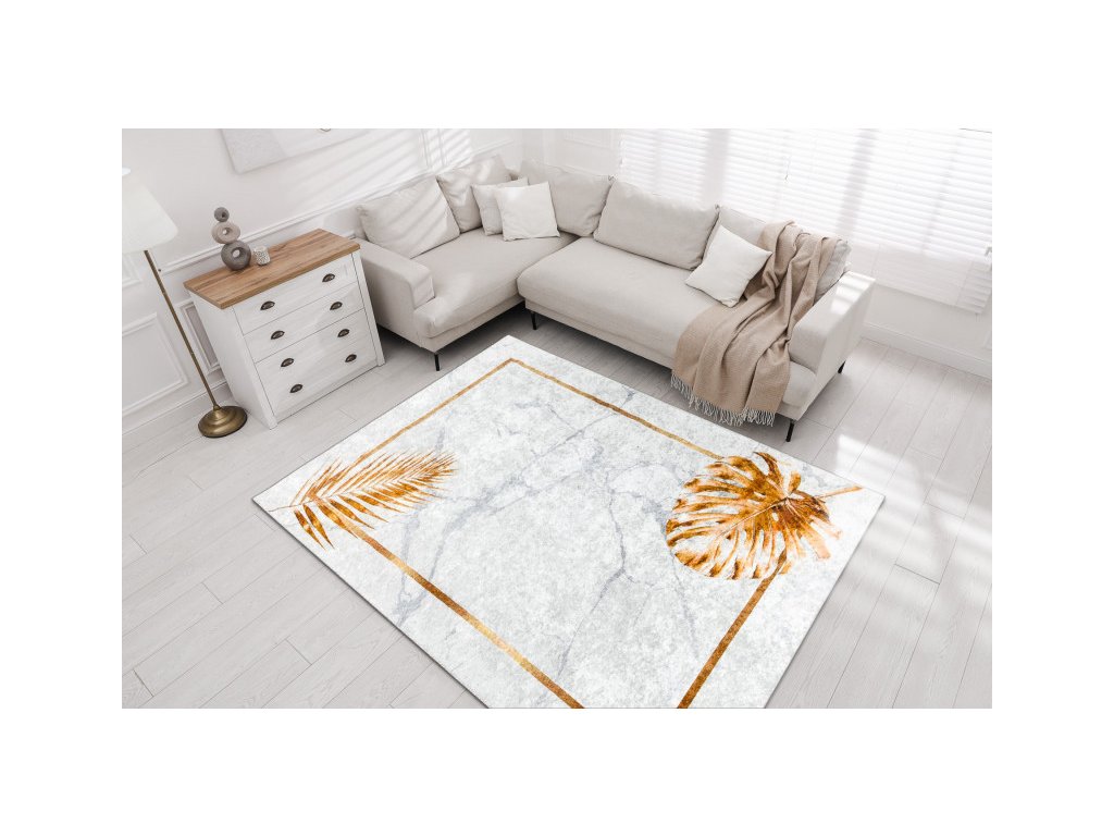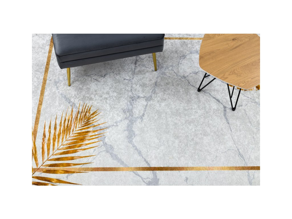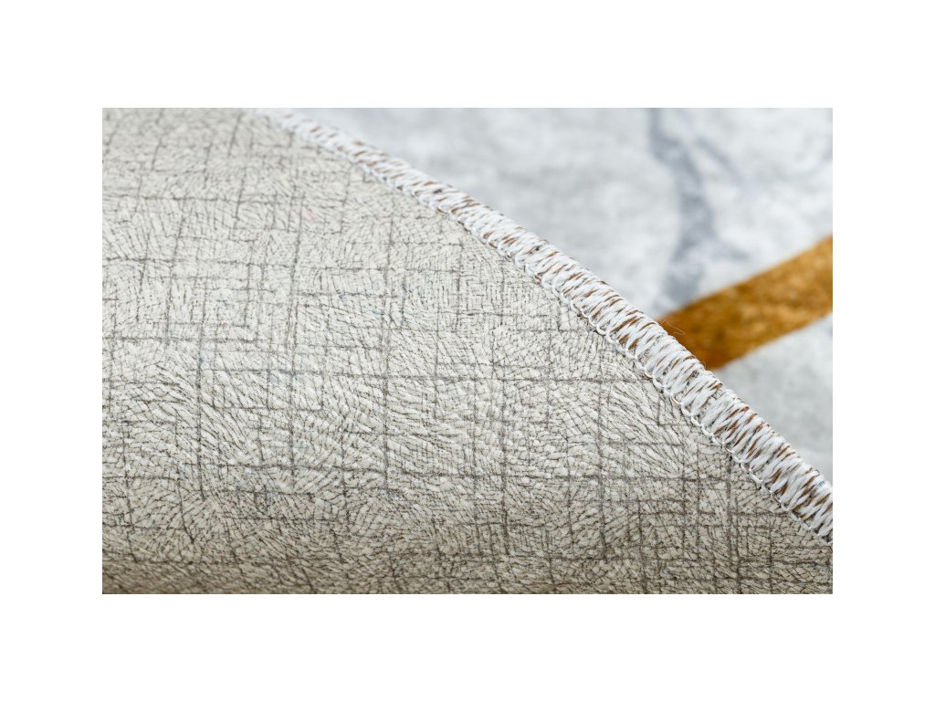 Světlý koberec s mramorovým vzhled se zlatými prvky. Krásný a velmi estetický koberec, který zaujme kde jakou návštěvu udělá nejen parádu, ale též nadchne jednoduchou údržbu, stačí vyprat v pračce do 30°C. Koberec můžete využít nejen v ložnici, v obýváku, snese si vlhčí prostor jako je kuchyně a koupelna. Díky protiskluzovému podkladu se nemusíte bát uklouznutí i na dlažbě. Koberec má velmi nízký střižený vlas vyrobený z polyesteru, který je vhodný i pro alergiky a děti.
