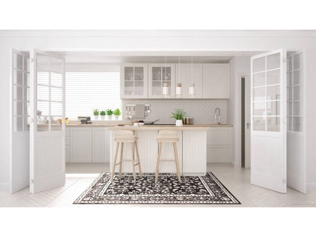 Tmavě hnědý koberec má uprostřed obdélník posetý kvítky a lístečky a okolo několik více či méně zdobných rámečků. V podstatě se jedná o obrázek v rámečku, na který se nebudete moct vynadívat. Jeho předností je hebký, měkký a komfortní povrch, protože se vyrábí z polyesterového vlákna a má střižený vlas.