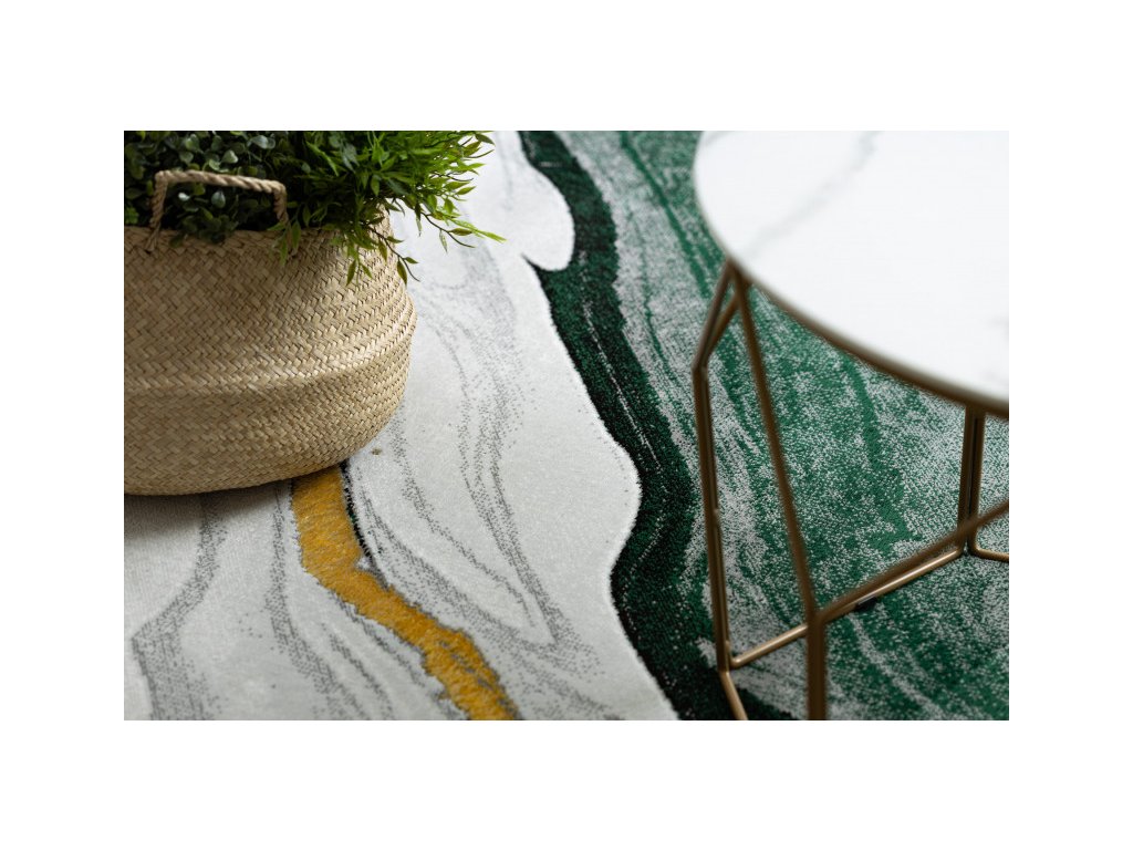 Koberec Emerald 1017 vyobrazuje velmi reálně mramor v láhvově zeleném zbarvení se zlatým prvkem. Tento koberec se stane výrazným středobodem v místnosti. Velkou předností tohoto koberce není jen vzhled, ale též je i velmi kvalitní. Spojením polypropylenu a polyesteru, vytváří velmi kvalitní, pevnou a na dotyk příjemnou strukturu, která je odolná a stálá. Ve vláknech polyester též vytváří odlesky a tím prohlubuje estetický ráz koberce. Koberec lze položit v prostorech s podlahovým vytápěním.