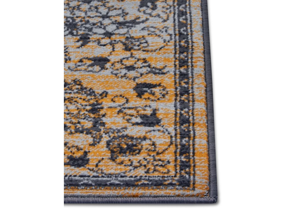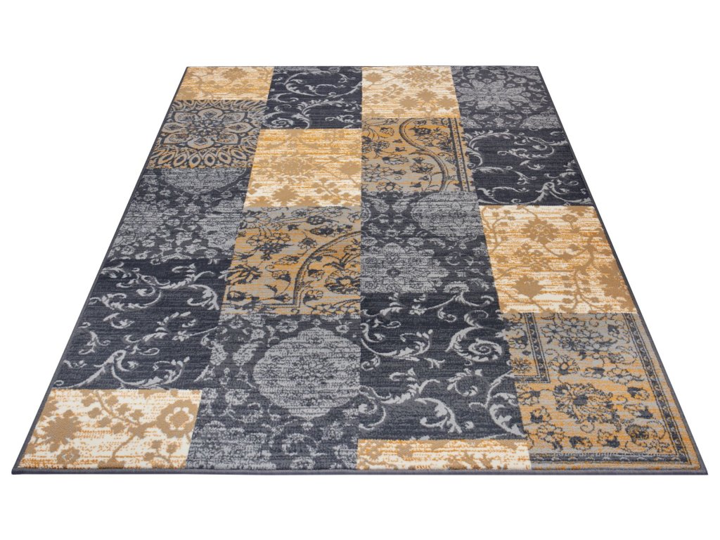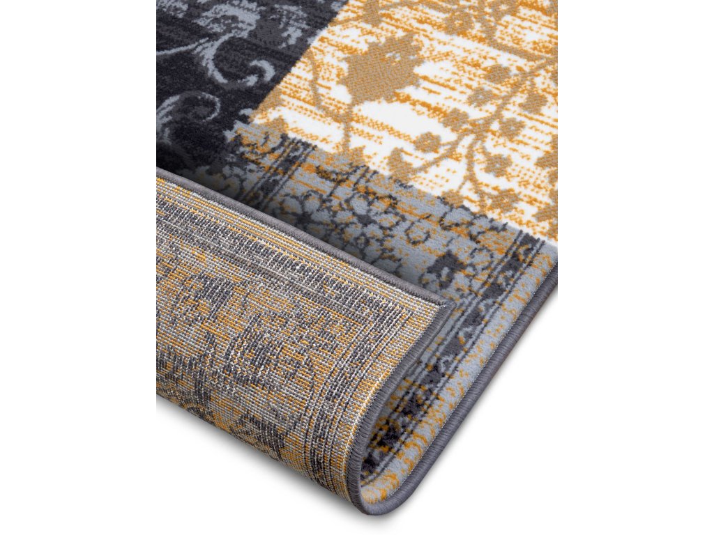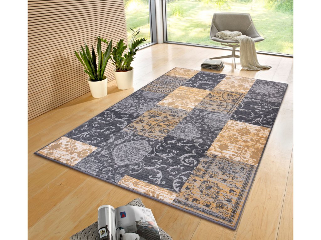Tento krasavec se může pyšnit propracovaným motivem v kombinaci šedé a hořčičně žluté barvy. Vypadá, jako by ho tvořilo několik malých koberečků sešitých dohromady. Kvalitní koberec ve vintage stylu vyrobený ze 100% polypropylenu se pro své vlastnosti nejlépe hodí do ložnice nebo obývacího pokoje.