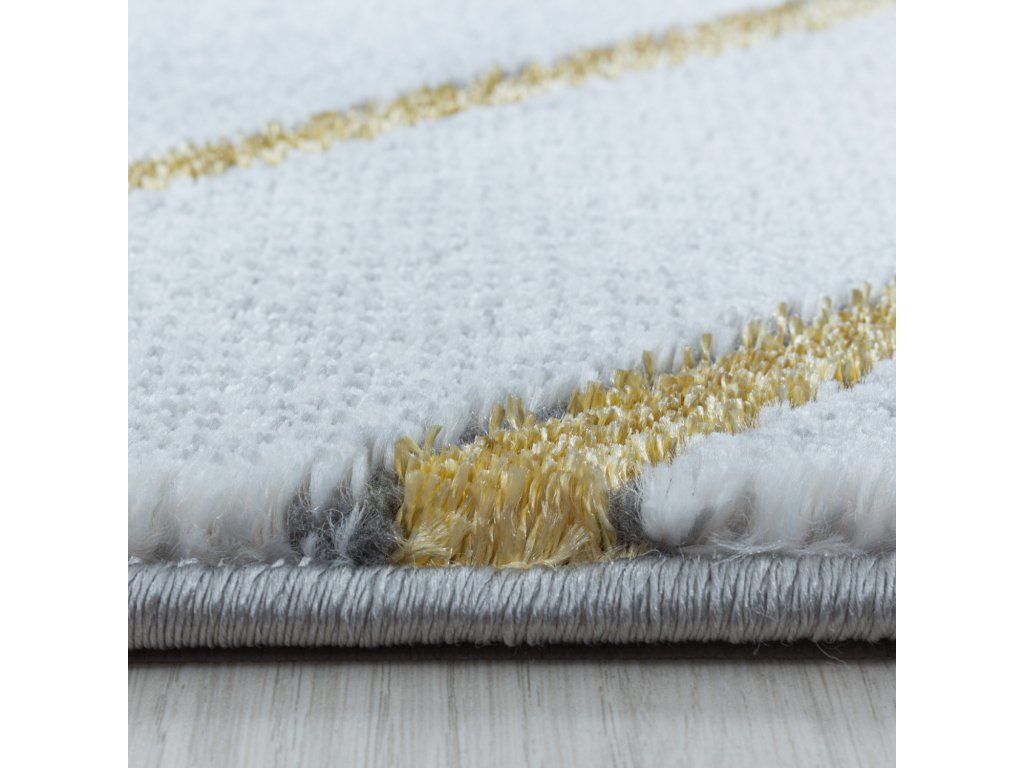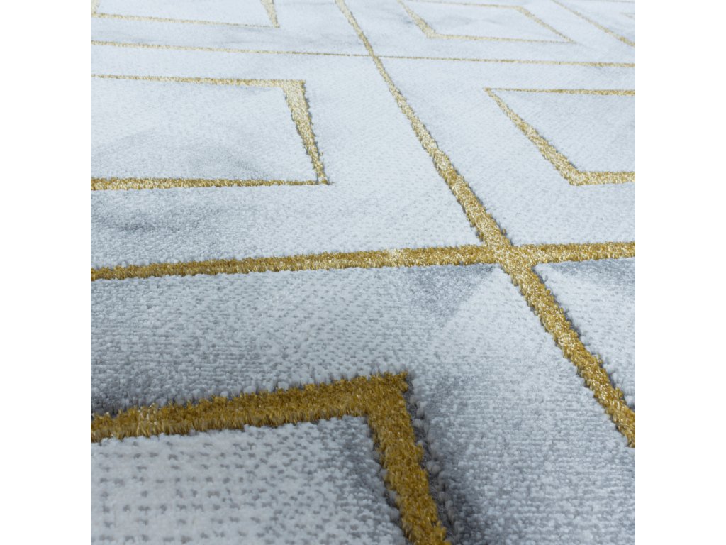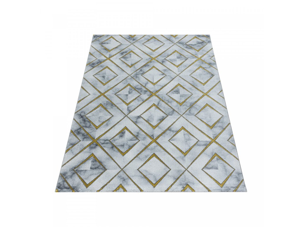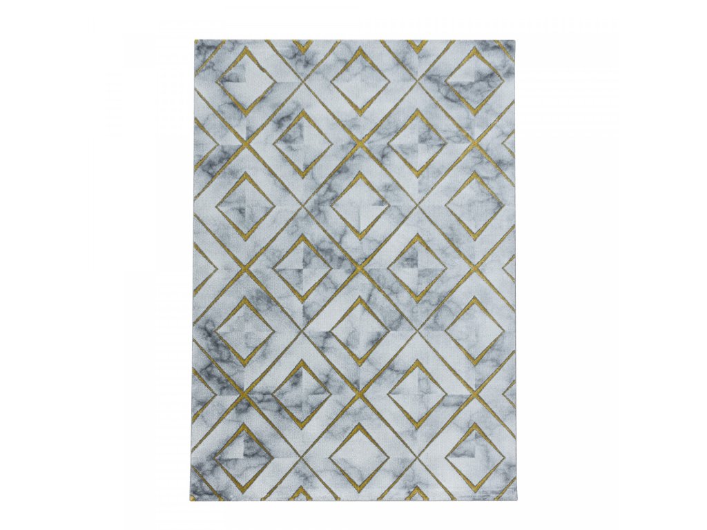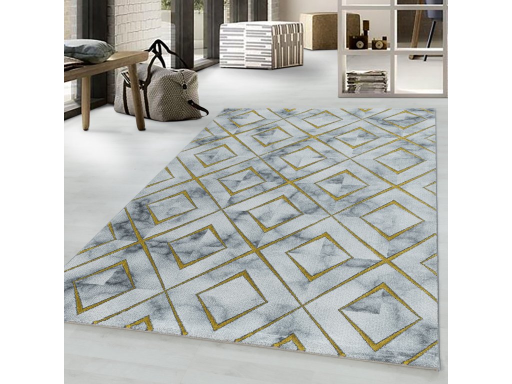 Mramorový koberec se zlatými kosočtverci, který Vaší domácnosti dodá nádech elegance. To je kusový koberec Naxos 3811 gold vyrobený v Turecku z polypropylenu heatset a polyesteru. Tato kombinace materiálu zajišťuje, že je koberec odolný a zároveň příjemný na dotek. Další výhodou je snadná údržba díky poměrně krátkému vlasu.
