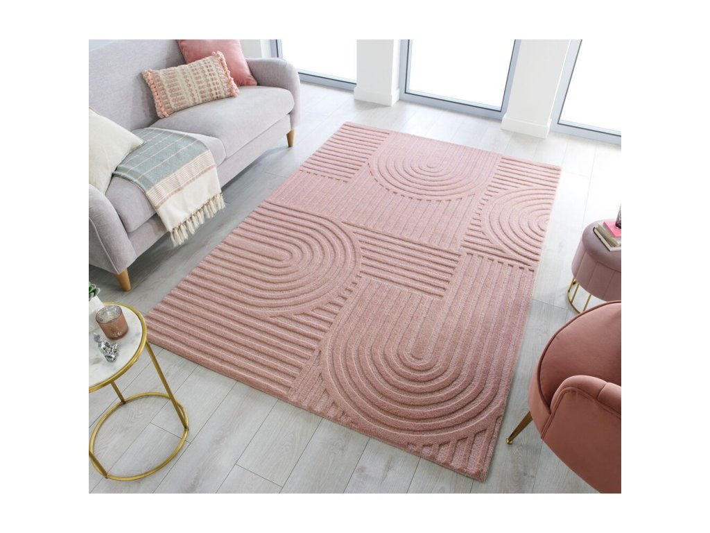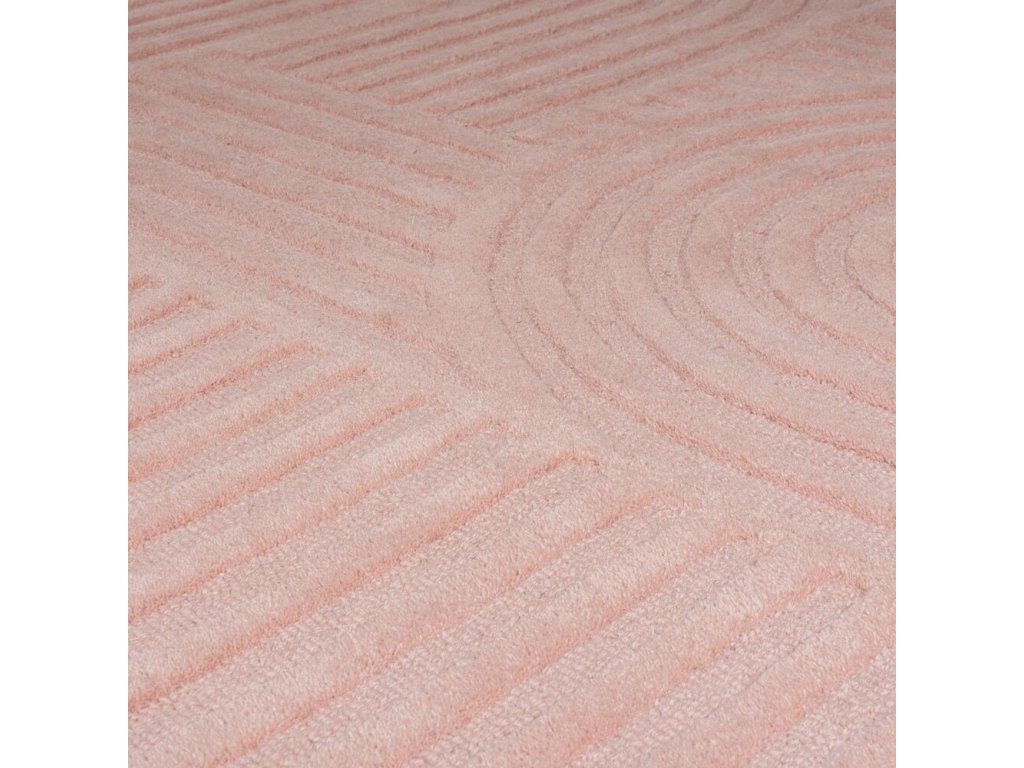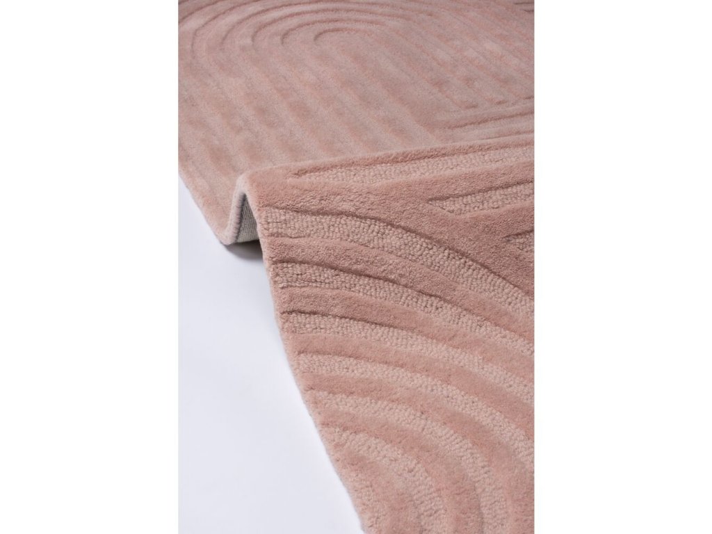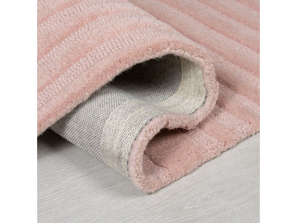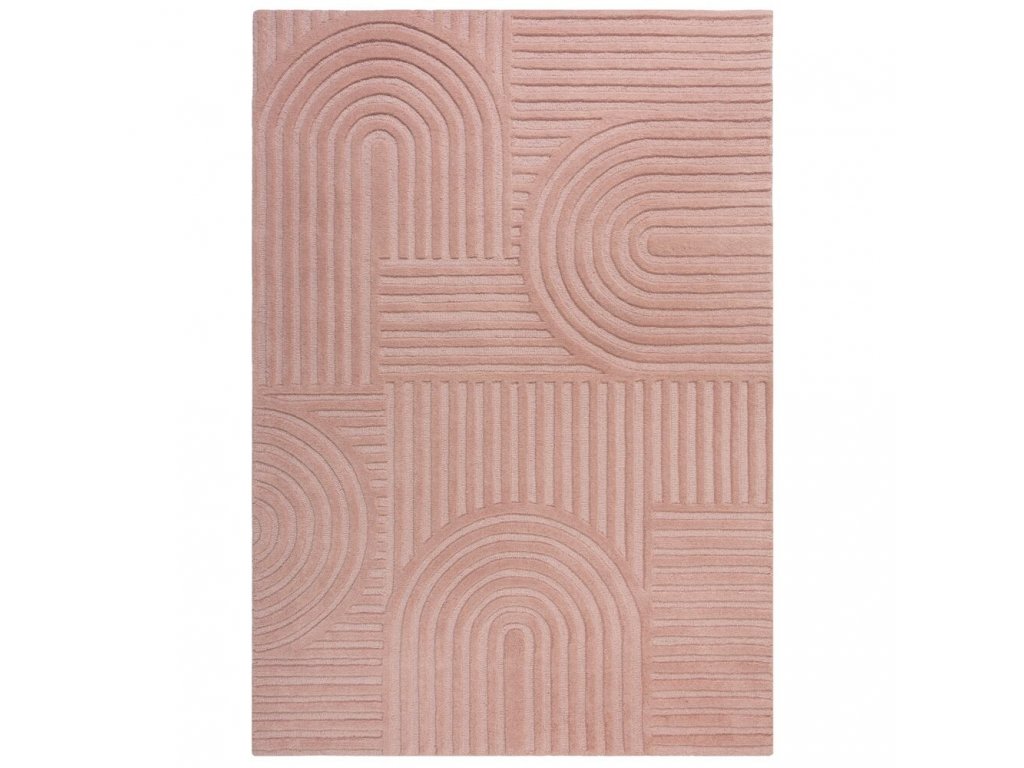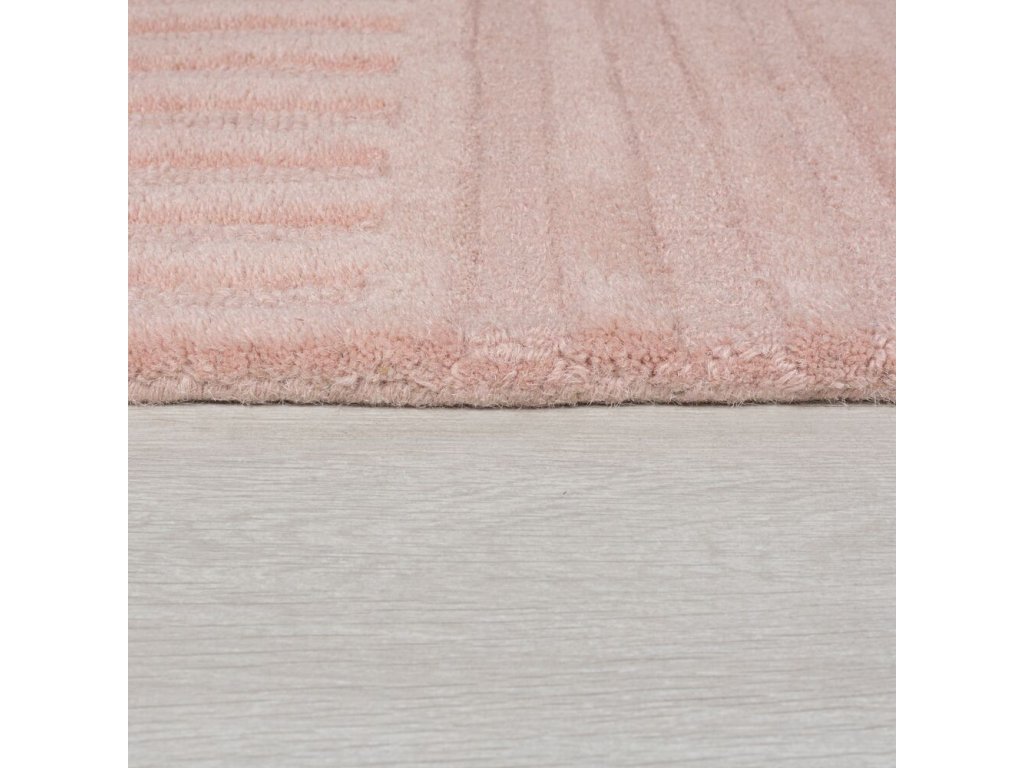 Pudrově růžový koberec se zajímavým plastickým vzorem. Jedná se o strojově vyráběný kousek v Indii z přírodní vlny, který se může pyšnit přirozenou hřejivostí a izolací hluku. Pro své vlastnosti se nejlépe hodí do obývacího pokoje nebo ložnice.