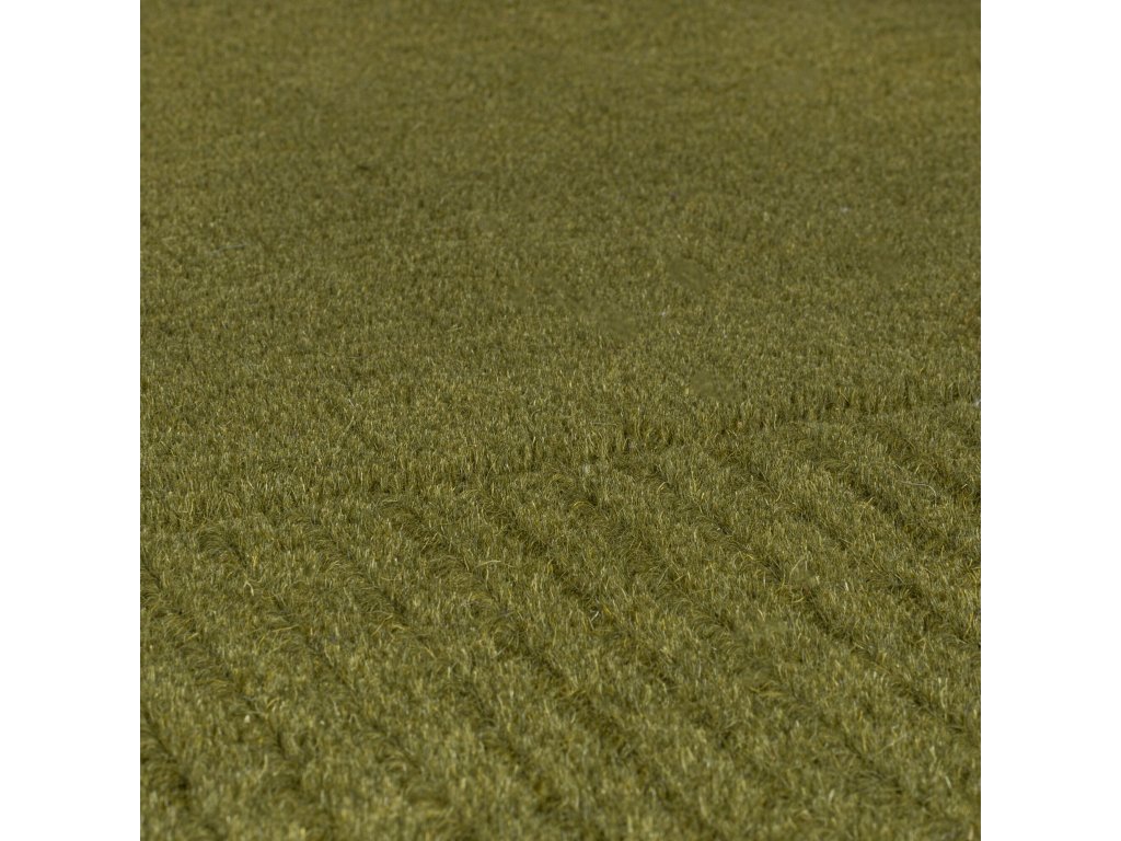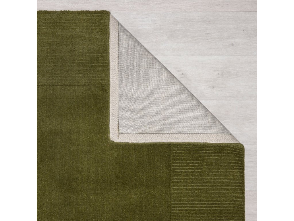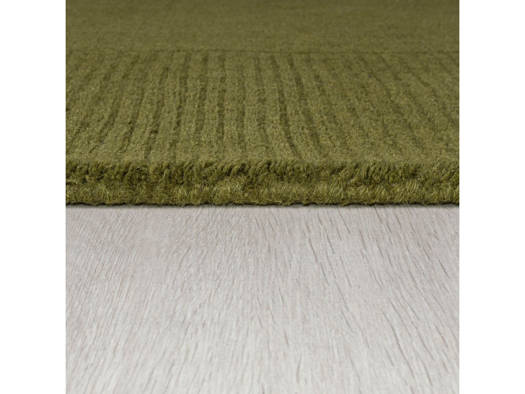 Olivově zelený koberec se zajímavým lemováním jistě ocení nejen milovníci zelených oliv. Skvěle doplní každý interiér a můžete ho položit i na podlahové topení. Pocit tepla od nohou však koberec zajistí, i když ho položíte na studenou dlažbu, protože se vyrábí z hřejivé přírodní vlny. Jeho povrch je tak měkký a velmi příjemný, což oceníte především u postele nebo pohovky.